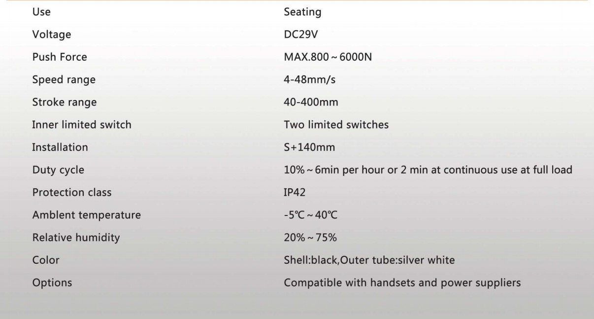 本產品已通過CE、UL、PSE、ISO9001認證,它有一個新穎的外觀和制作精良,噪音小,操作簡單,讓它成為暢銷國內外,被廣泛用于電動沙發(fā)、醫(yī)療床、手術床,按摩椅等。