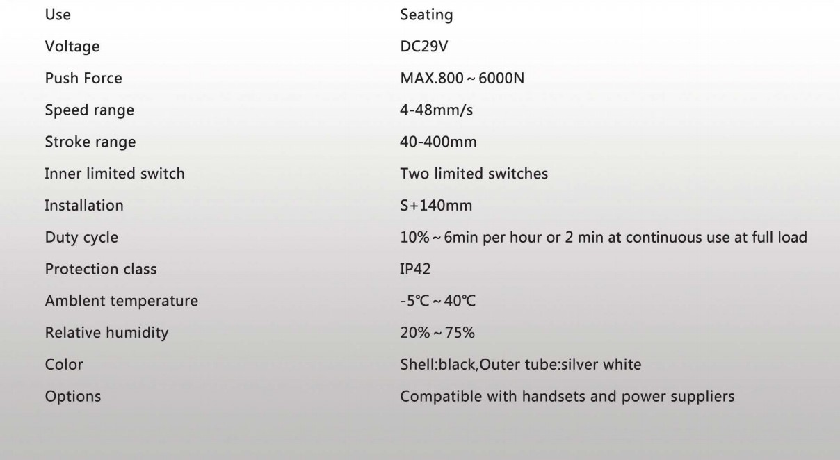 本產(chǎn)品已通過CE、UL、PSE、ISO9001認(rèn)證,它有一個(gè)新穎的外觀和制作精良,噪音小,操作簡單,讓它成為暢銷國內(nèi)外,被廣泛用于電動沙發(fā)、醫(yī)療床、手術(shù)床,按摩椅等。