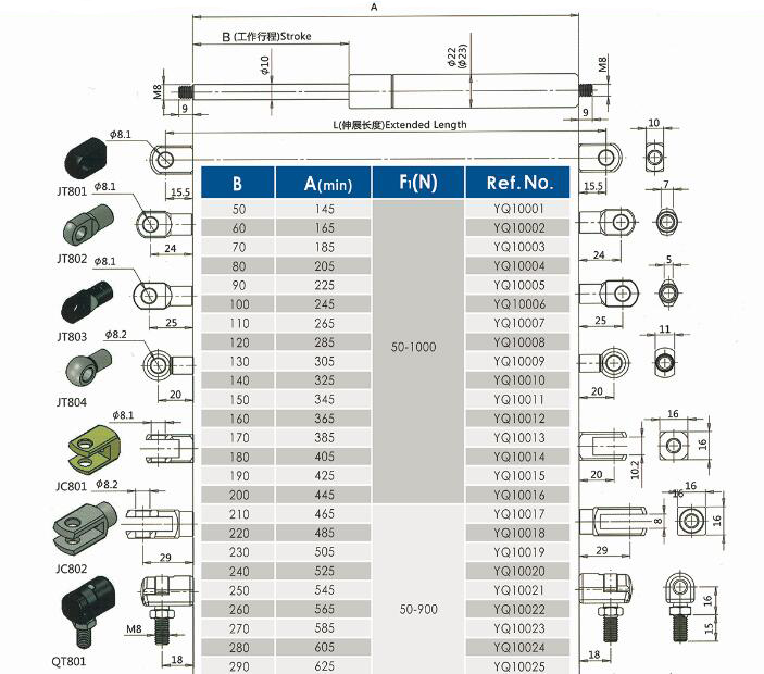 注:由于氣彈簧是非標準的,以上僅為型號的一部分。我們可以根據(jù)客戶的要求定制。