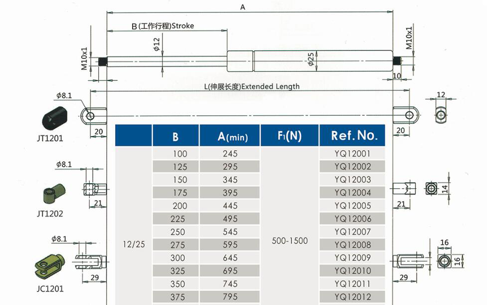 注:由于氣彈簧是非標(biāo)準(zhǔn)的,以上僅為型號(hào)的一部分。我們可以根據(jù)客戶的要求定制。