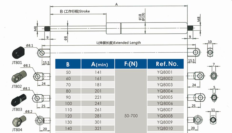 注:由于氣彈簧是非標(biāo)準(zhǔn)的,以上僅為型號(hào)的一部分。我們可以根據(jù)客戶的要求定制。